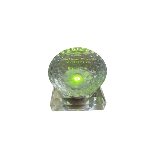 Polovina golfového míčku s plochou pro gravírování. Je umístěna na podstavci se zabudovaným LED světlem a tak trofej dostává nečekaný efekt spodního světla, které ještě mění svou barvu. Vyrobeno z kvalitního skla. Dobíjecí USB kabel v ceně
